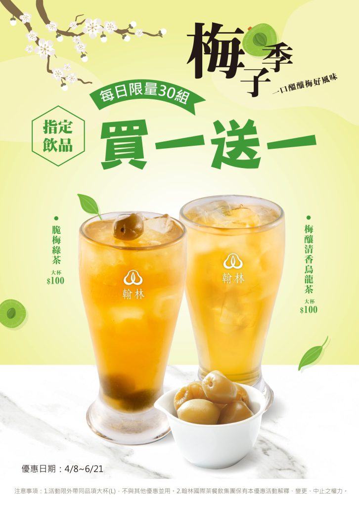 1.活動不得與其他優惠活動併用。2.活動限外帶大杯同品項。3.翰林國際茶餐飲集團保有本活動解釋、修改、中止之權力。